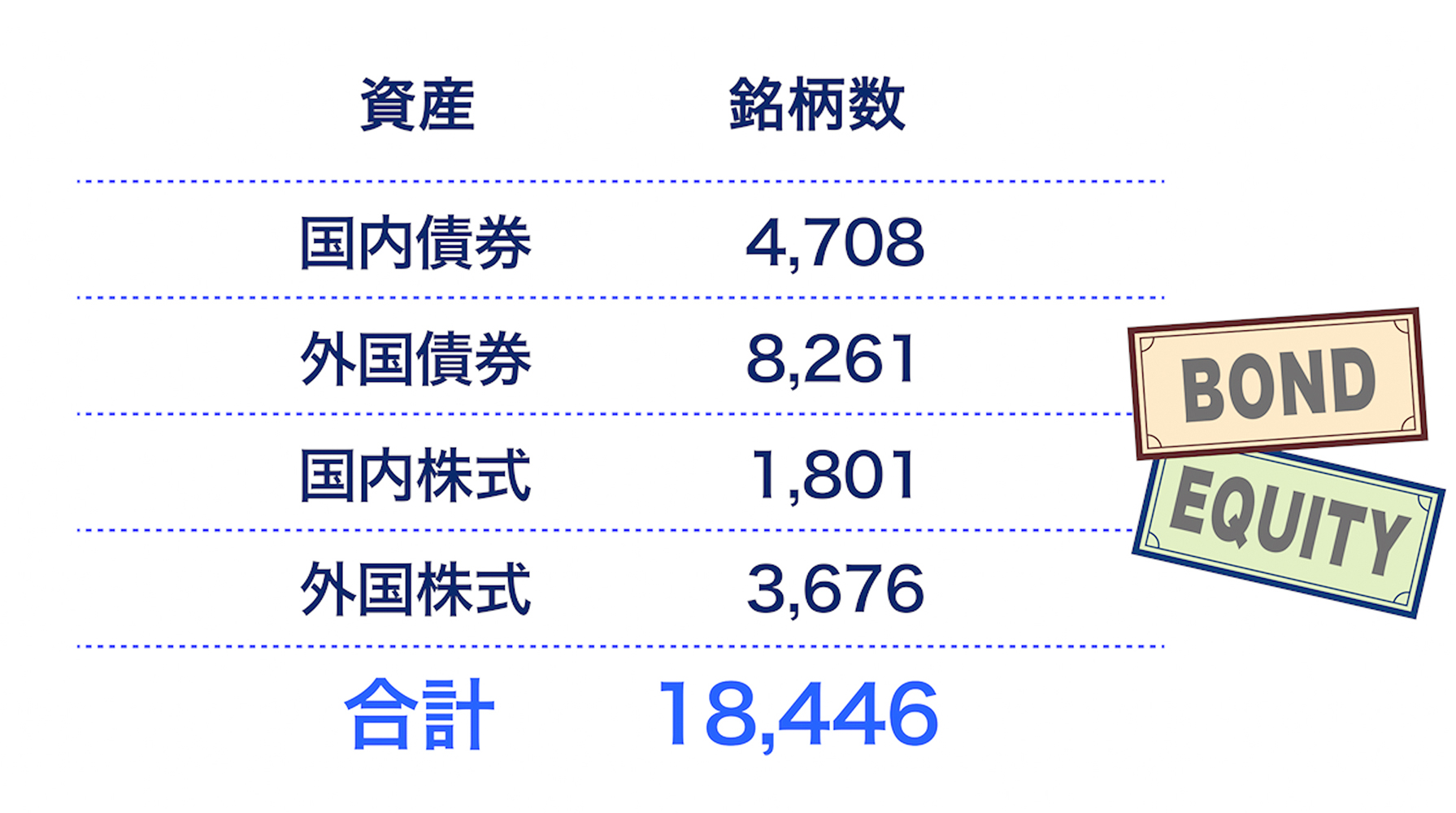 先ほどの基本ポートフォリオにあったように、大まかには「国内債券」「外国債券」「国内株式」「外国株式」の4つの資産に投資しているんだけど、2024年度の終わりには、それぞれの資産で合計1万8,446銘柄と、かなり多くの銘柄に分散投資しているんだ。 それだけ多くの銘柄に分散することによってリターンを安定させて、短期的にも損失を計上する可能性をできるだけ低く抑えているんだよ。
