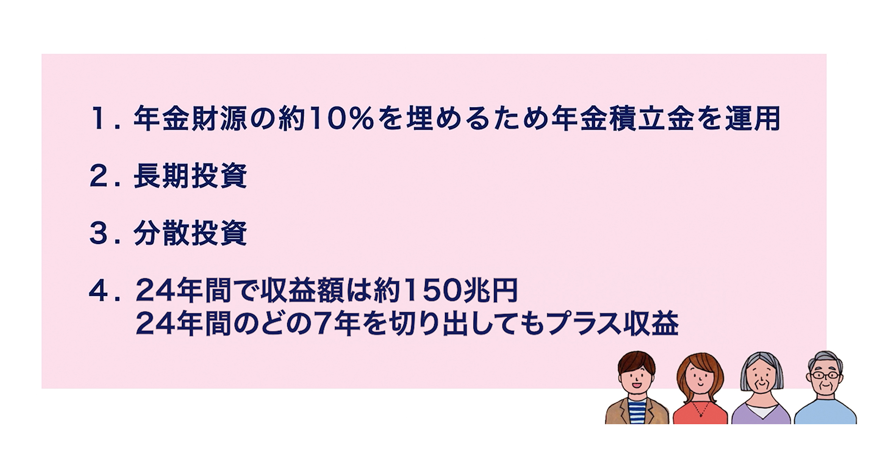 まず、日本の少子高齢化によって将来、年金の財源が不足して保険料負担が大きくなりすぎる可能性があること。そうならないように年金財源の約10%を賄う年金積立金が用意されていて、GPIFが将来世代のためにそれを運用していることだね。