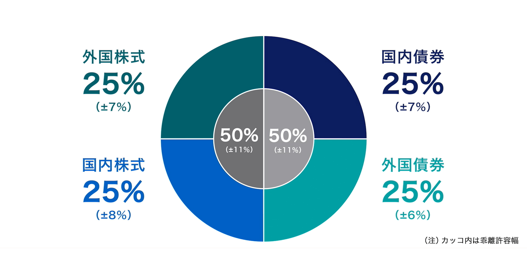 GPIFが投資運用する資産の構成割合は「国内債券」「国内株式」「外国債券」「外国株式」に4分の1ずつ。これがGPIFが2020年4月から採用している基本ポートフォリオです。